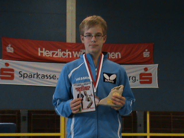Spät abends stand für Hessen ein Spieler ganz oben auf dem Siegestreppchen: Marco Grohmann. In den Mannschaftskämpfen mit nur einer Niederlage behaftet, schaffte er es, sich im Halbfinale in einem begeisternden Spiel gegen Noah Weber über viele Spin-Spinduelle knapp durchzusetzen. Im Finale gegen den gefährlichen Linkshänder Marcel Kutzner, holte Marco nochmals alle Reserven hervor um seinen Gegner regelgerecht niederzuringen. Ein toller Erfolg für den symphatischen und stets kämpferischen Marco Grohmann!