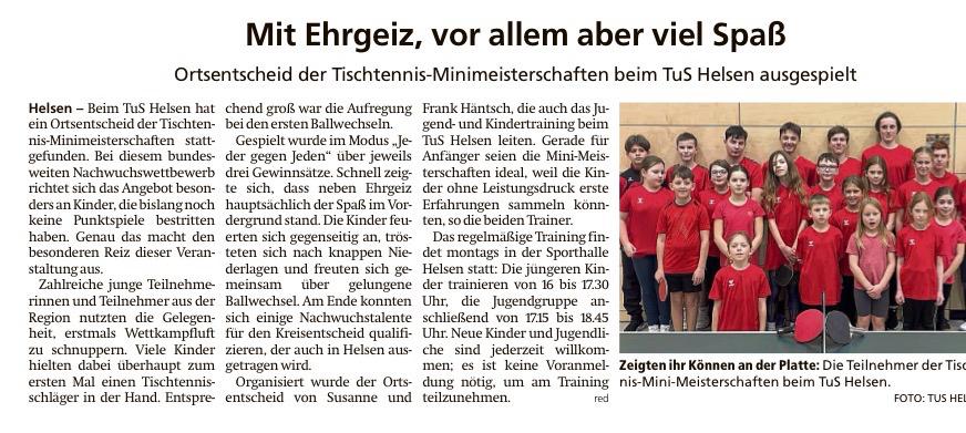 Beim TuS Helsen hat ein Ortsentscheid der Tischtennis- Minimeisterschalten statt gefunden.